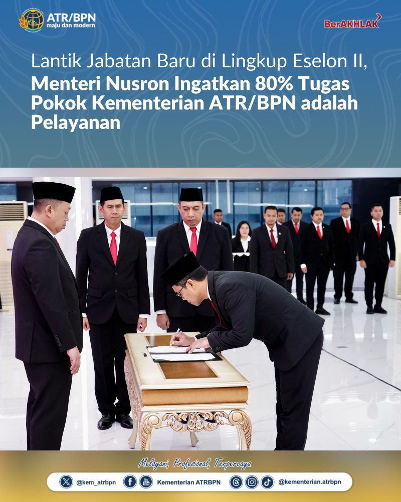 Jakarta – Menteri Agraria dan Tata Ruang/Kepala Badan Pertanahan Nasional (ATR/BPN), Nusron Wahid, melantik sejumlah Pejabat Pimpinan Tinggi Pratama (Eselon II) di lingkungan Kementerian ATR/BPN pada Rabu (23/07/2025). Dalam pelantikan yang berlangsung di Aula Prona, Jakarta ini, Menteri Nusron mengingatkan kembali bahwa inti dari tugas pokok Kementerian ATR/BPN adalah pelayanan kepada masyarakat.