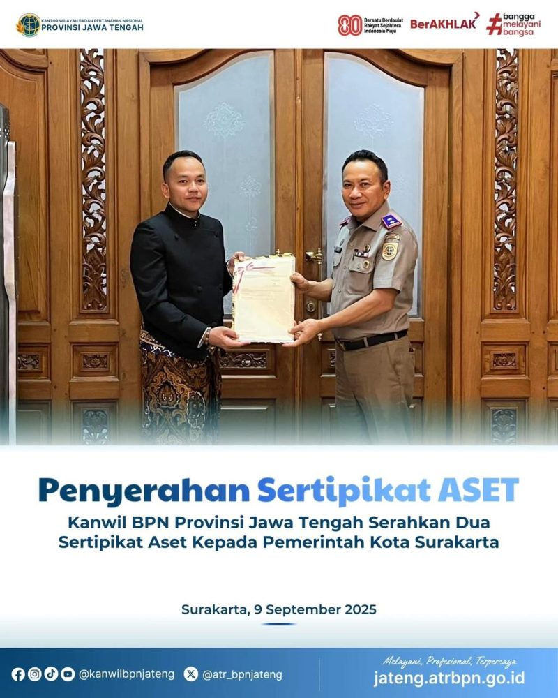 Solo – Wali Kota Solo, Respati Ardi secara resmi menerima dua sertipikat aset milik Pemerintah Kota Surakarta. Penyerahan tersebut dilakukan langsung oleh Kepala Kantor Wilayah Badan Pertanahan Nasional Provinsi Jawa Tengah, Lampri yang didampingi oleh Kepala Kantor Pertanahan Kota Surakarta, Wahjoe Noer Siswati (9/9/2025).