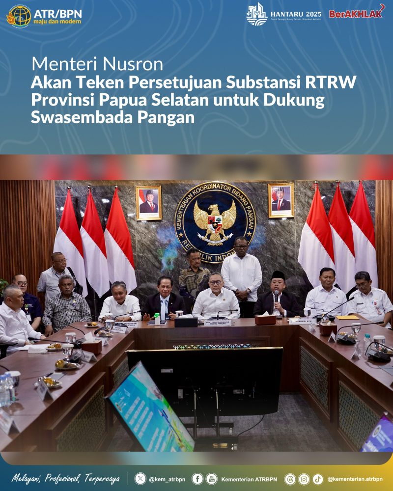 “Hari ini kita rapat lintas sektoral dalam pembahasan konsep persetujuan RTRW Provinsi Papua Selatan. Insyaallah dalam waktu 1-2 hari mendatang, Persetujuan Substansi RTRW Provinsi Papua Selatan akan kami teken persetujuannya,” kata Menteri Nusron usai menghadiri Rapat Koordinasi Terbatas Tingkat Menteri Lintas Sektor di Kantor Kementerian Koordinator Bidang Pangan, Jakarta, Rabu (01/10/2025).