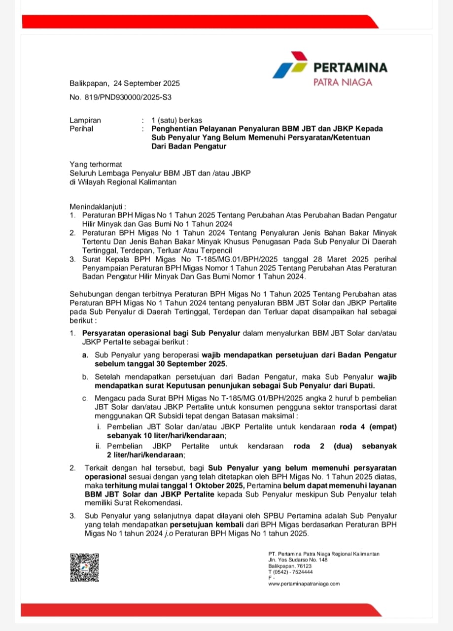 Nurjali menilai kebijakan ini memberatkan masyarakat, terutama di daerah pedalaman yang sangat bergantung pada sub penyalur dengan kuota BBM subsidi terbatas.