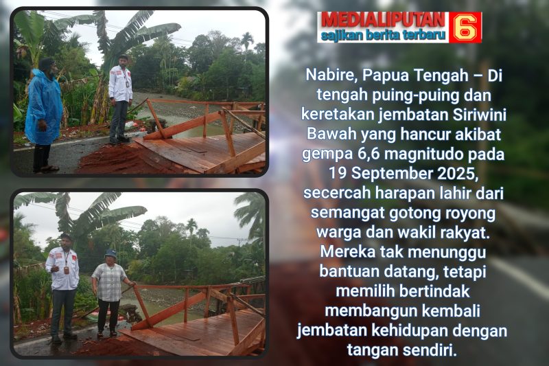 Medialiputan6.com, Nabire, Papua Tengah – Di tengah puing-puing dan keretakan jembatan Siriwini Bawah yang hancur akibat gempa 6,6 magnitudo pada 19 September 2025, secercah harapan lahir dari semangat gotong royong warga dan wakil rakyat. Mereka tak menunggu bantuan datang, tetapi memilih bertindak membangun kembali jembatan kehidupan dengan tangan sendiri.