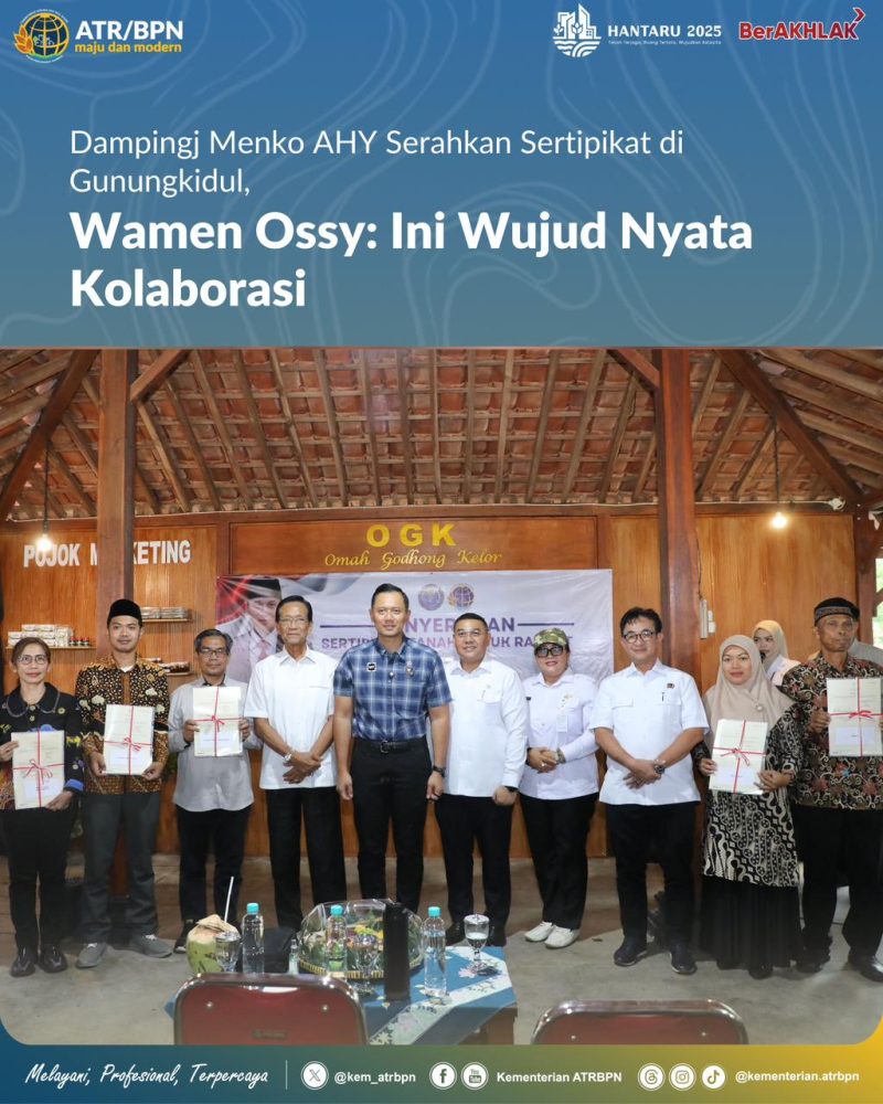 “Penyerahan sertipikat ini menjadi wujud nyata kolaborasi antara pemerintah pusat, daerah, dan masyarakat, dalam memperkuat kepastian hukum atas tanah,” ungkap Wamen Ossy saat mendampingi Menteri Koordinator Bidang Infrastruktur dan Pembangunan Kewilayahan (Menko IPK), Agus Harimurti Yudhoyono (AHY), dalam penyerahan sertipikat di Desa Kelor, Kabupaten Gunungkidul.
