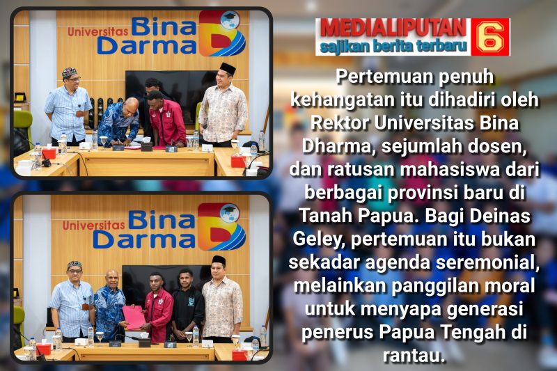 Pertemuan penuh kehangatan itu dihadiri oleh Rektor Universitas Bina Dharma, sejumlah dosen, dan ratusan mahasiswa dari berbagai provinsi baru di Tanah Papua. Bagi Deinas Geley, pertemuan itu bukan sekadar agenda seremonial, melainkan panggilan moral untuk menyapa generasi penerus Papua Tengah di rantau.