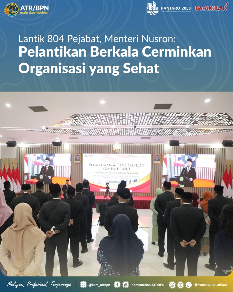 Jakarta, Medialiputan6.com – Menteri Agraria dan Tata Ruang/Kepala Badan Pertanahan Nasional (ATR/BPN), Nusron Wahid, melantik 804 pejabat di lingkungan Kementerian ATR/BPN pada Rabu (08/10/2025). Dalam sambutannya, Menteri Nusron menyebut pelantikan yang dilakukan secara berkala menandakan roda organisasi Kementerian ATR/BPN berjalan dengan baik.