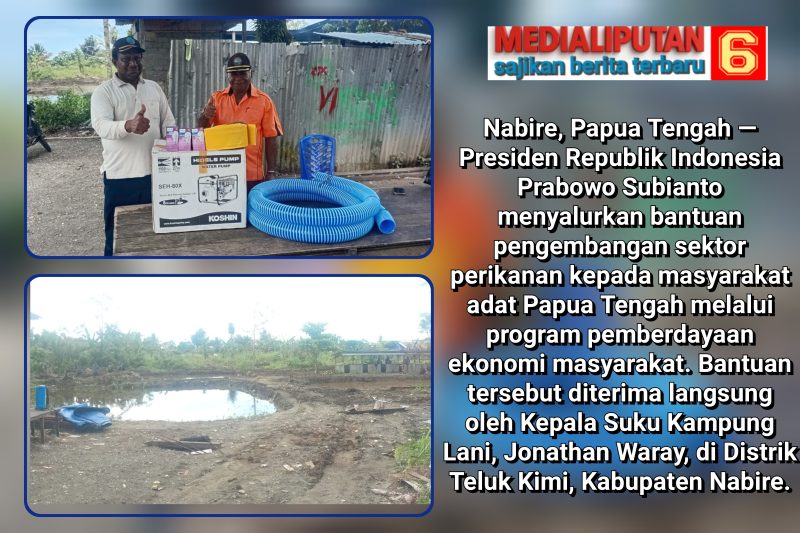Medialiputan6.com, Nabire, Papua Tengah —Presiden Republik Indonesia Prabowo Subianto menyalurkan bantuan pengembangan sektor perikanan kepada masyarakat adat Papua Tengah melalui program pemberdayaan ekonomi masyarakat. Bantuan tersebut diterima langsung oleh Kepala Suku Kampung Lani, Jonathan Waray, di Distrik Teluk Kimi, Kabupaten Nabire.
