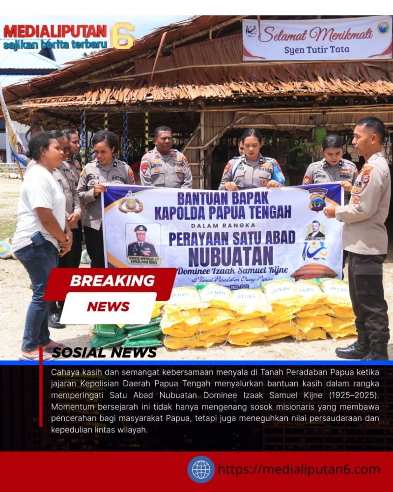 Medialiputan6.com, Teluk Wondama, Papua Barat — Cahaya kasih dan semangat kebersamaan menyala di Tanah Peradaban Papua ketika jajaran Kepolisian Daerah Papua Tengah menyalurkan bantuan kasih dalam rangka memperingati Satu Abad Nubuatan Dominee Izaak Samuel Kijne (1925–2025). Momentum bersejarah ini tidak hanya mengenang sosok misionaris yang membawa pencerahan bagi masyarakat Papua, tetapi juga meneguhkan nilai persaudaraan dan kepedulian lintas wilayah.