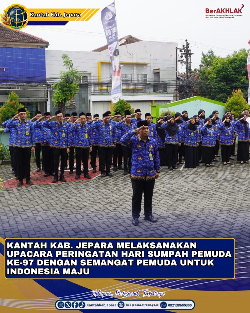 Jepara,Medialiputan6.com – Selasa 28 Oktober 2025 Kantor Pertanahan Kabupaten Jepara melaksanakan Upacara Peringaan Hari Sumpah Pemuda ke-97 Tahun 2025. Dilaksanakan di halaman Kantor Pertanahan Kab. Jepara secara tertib dan khidmat dengan diikuti oleh seluruh staff Kantah Kab. Jepara.